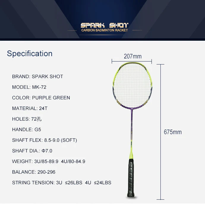 Racket MK72 ขนาด 7.0 มม. MK72 ทำจากวัสดุคาร์บอนเต็มรูปแบบ มีเส้นผ่านศูนย์กลางเพลา 7.0 มม. สำหรับผู้เล่นมืออาชีพ